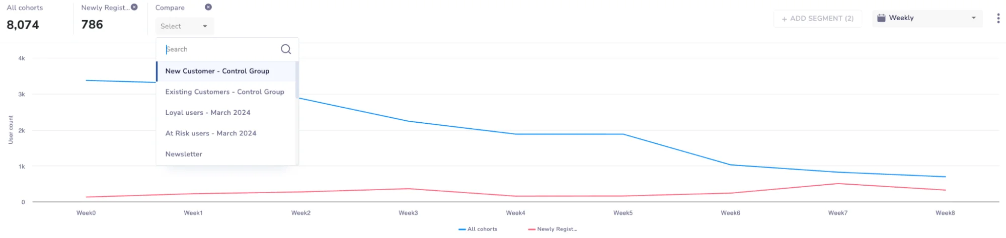 - Segment comparison: Compare different segments to uncover how cohorts perform across different segments.