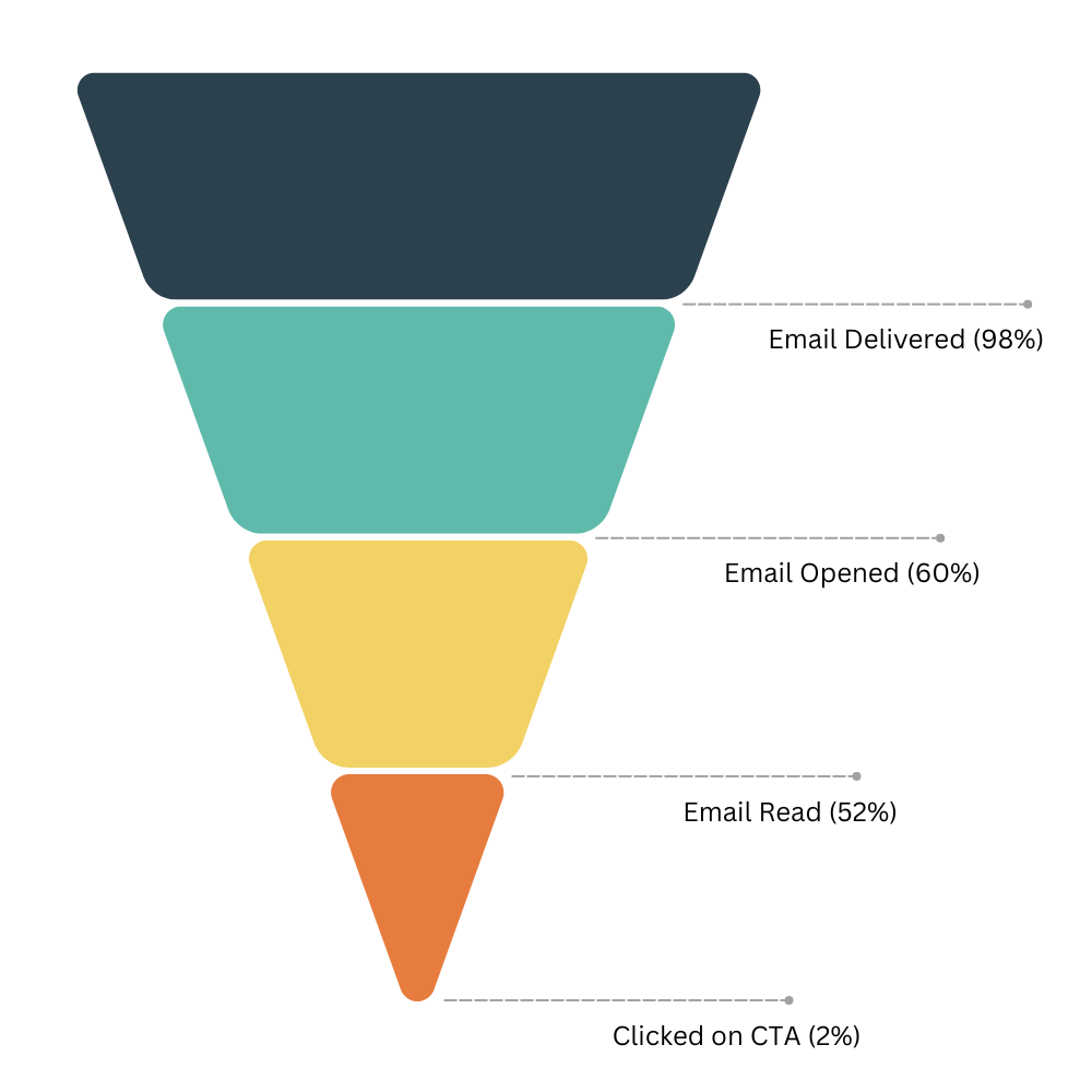 In this funnel, you can identify that the problem is the Click-through rate (CTR). Your recipients receive the email; most open and read it but do not click the call-to-action button.